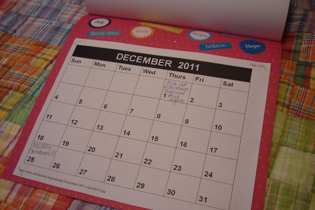 Justin and I discussed it and decided that for us, adding an item each day will work best (I don't want to put that we will look at lights on the 15 if it is raining that day! OR What if we've had a long day?...add "drink hot chocolate together" and you've got an event!)...each evening when Justin gets home we will open the calendar and see what we are doing that night as a family (sometime during the day JB and I will have discussed it and I will have added that night's activity to the calendar).